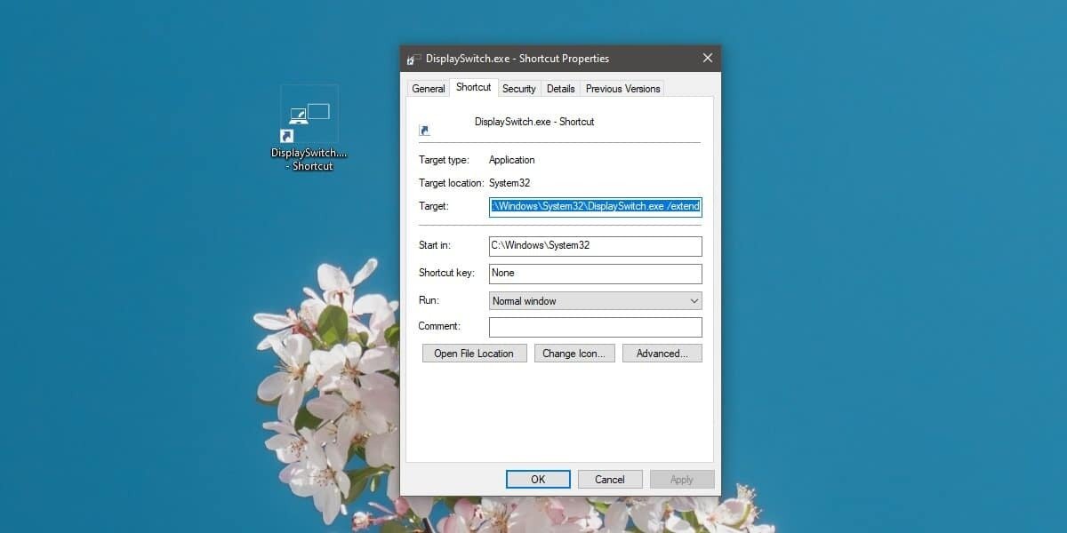 Look for an app called DisplaySwitch.exe. Right-click it and select Send to> Desktop (create shortcut). Go to the desktop and right-click the newly created shortcut to DisplaySwitch.exe, and select ‘Properties’ from the context menu.