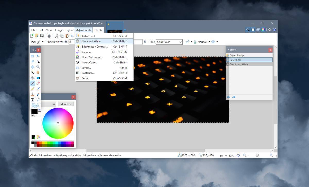 One of the best apps to convert an image to grayscale is Paint.net. It’s free and easy to use. Download and install Paint.net. Open the image that you want to convert to grayscale in Paint. Use the Ctrl+A keybaord shortcut to select everything on the current layer.