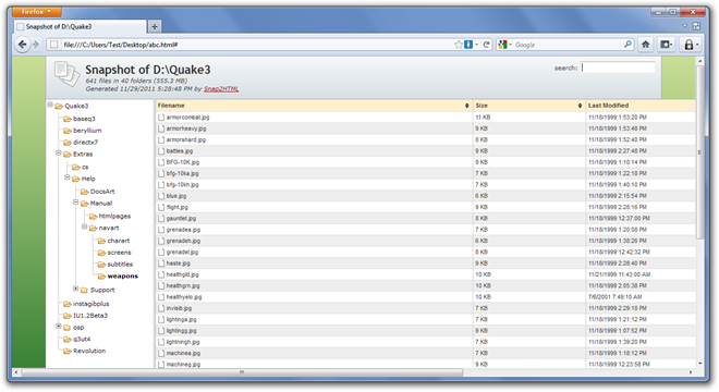 Once the HTML file is created, you can view the list of files and folders according to File Name, Size and Last Modified attributes. The top left corner displays the parent folder name, total number of files and folders, total size of the folder, and date and time when the snapshot was generated. You can navigate among the folders from the left pane, while the details appear on right side. There is a Search field available in the top right corner that can be used to search for items included in the folder structure.