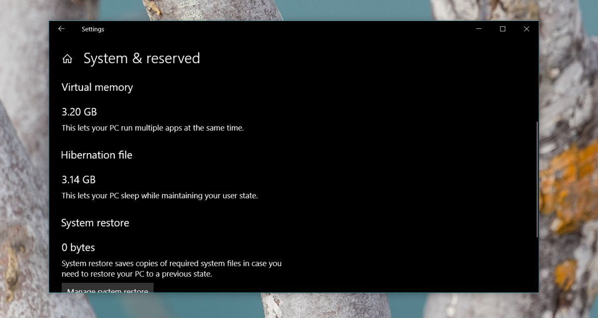 Restart your system for good measure and the hibernation file on Windows 10 will be gone. You can check the Storage tab in the System group of settings inside the Settings app to make sure the size of the hibernation file has been reduced to 0. It’s under System & Reserved.
