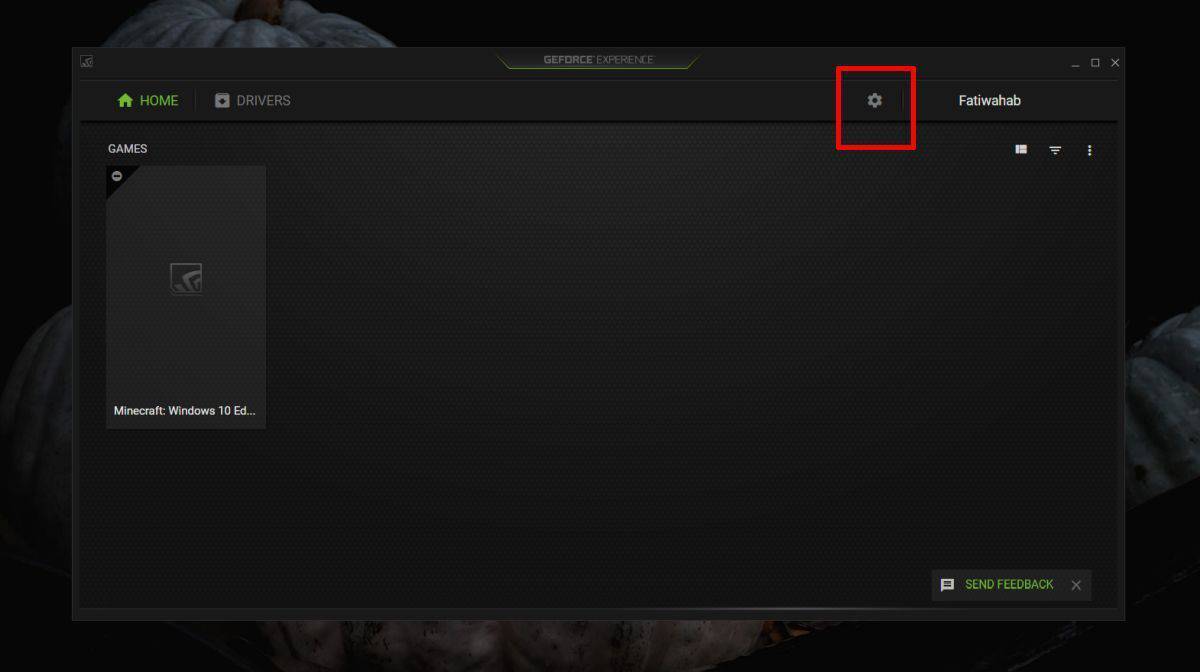 Open the Nvidia Game Experience app and click the cog wheel button at the top. This will open the Settings panel for the app.