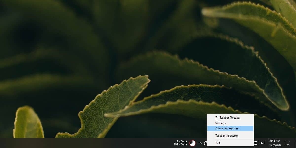 Download and run 7+ Taskbar Tweaker. The app has a portable version as well as an installable version so pick whichever you want to use. Once the app is running, right-click the app’s icon in the system tray and select ‘Advanced options’.