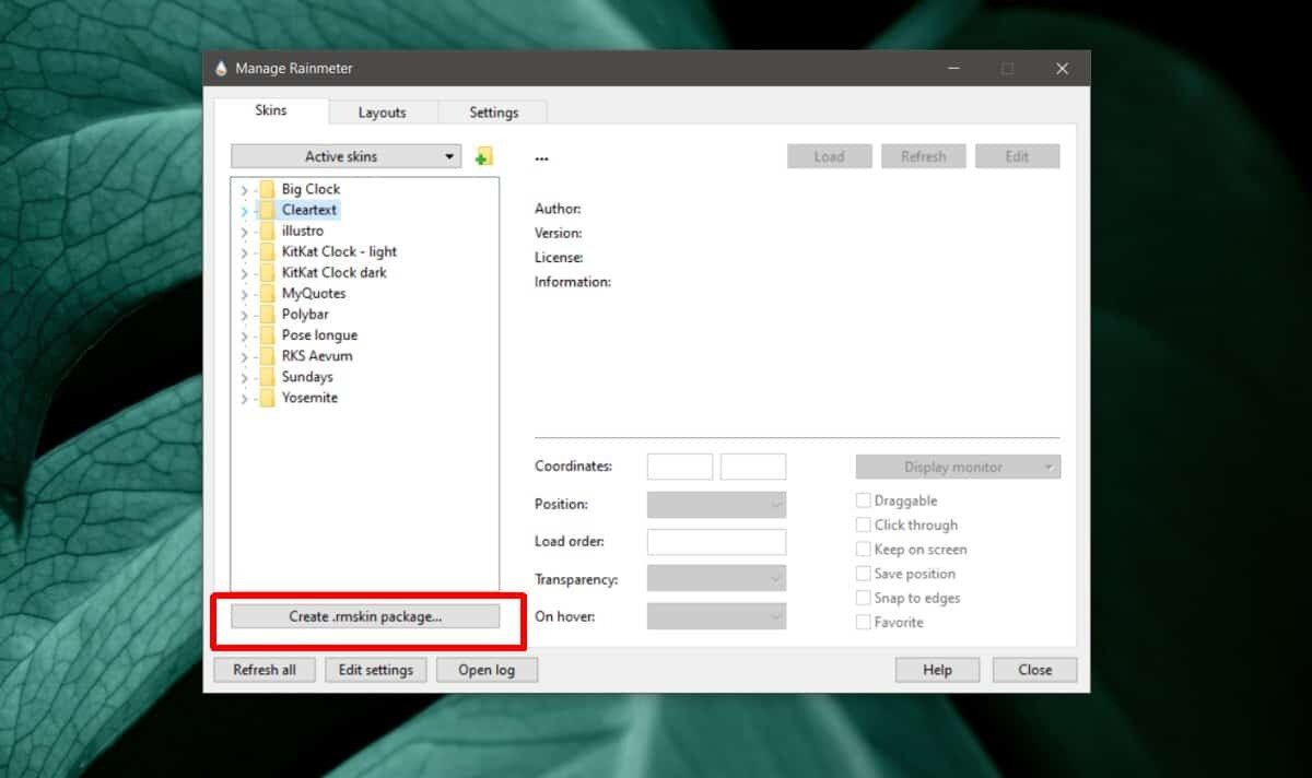 You must have Rainmeter already installed on your system. Open it, and click the Create .rmskin package button.
