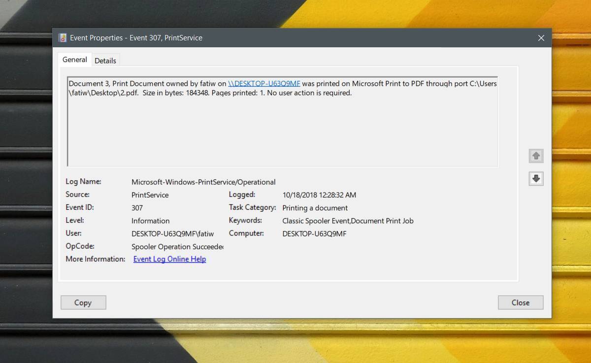 The print log tells you when a document was printed, and if you’re printing an actual hard copy instead of printing to PDF it will also tell you which document was printed. The following log shows the event that was created when a print job was sent to the Microsoft Print to PDF printer option. It gives the date and time of the print job, as well as which user initiated the print job if you go to the Details tab.