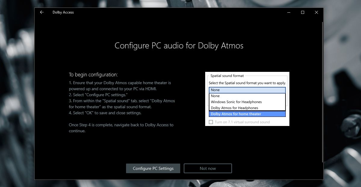 Once Dolby Access updates to support headphones, you will be able to use this app to enable spatial sound in Windows 10 for your headphones as well. You will essentially have a choice after that; you can use default virtual surround sound or you can use Dolby’s configurations.