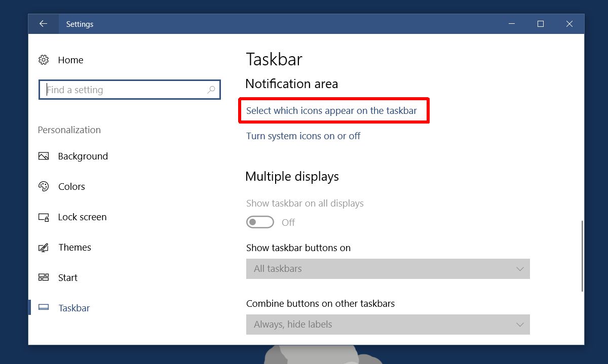 Open the Settings app. Go to the Personalization group of settings. Select the Taskbar tab. Scroll down to the ‘Notification Area’ section and click ‘Select which icons appear on the taskbar’.