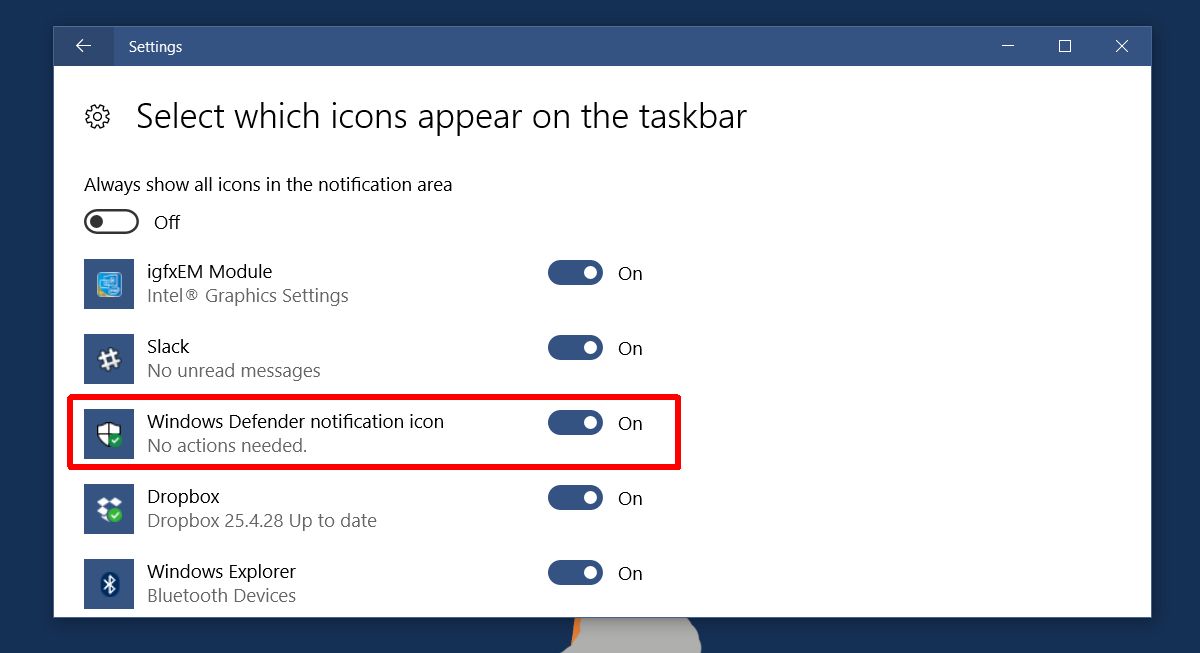 Here, turn off the Windows Defender icon. This is not the same as hiding the icon in the overflow menu. This will remove the icon from the system tray altogether. It will not disable alerts from Windows Defender.