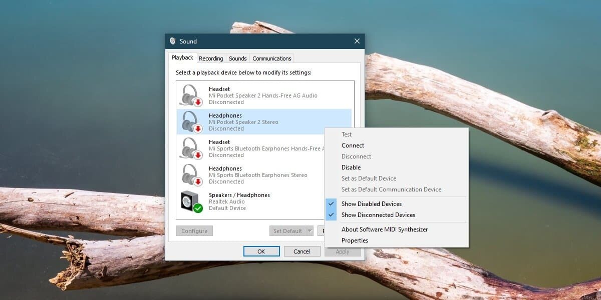 Access the Control Panel sound settings. Go to the Playback tab and right-click in an empty area inside the list of enabled devices. From the context menu, select ‘Show disabled devices’ and ‘Show disconnected devices’.