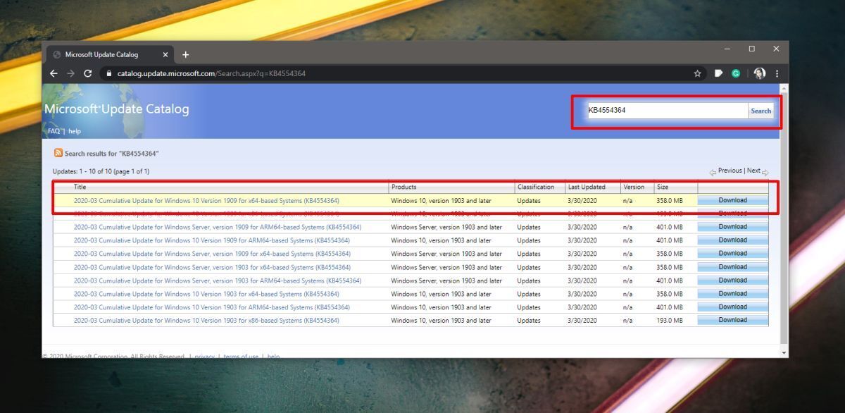 The fix can be downloaded from Microsoft’s update catalog. You can visit the website here. When you visit the website, you will see every single update that Microsoft rolls out to various versions of Windows 10.