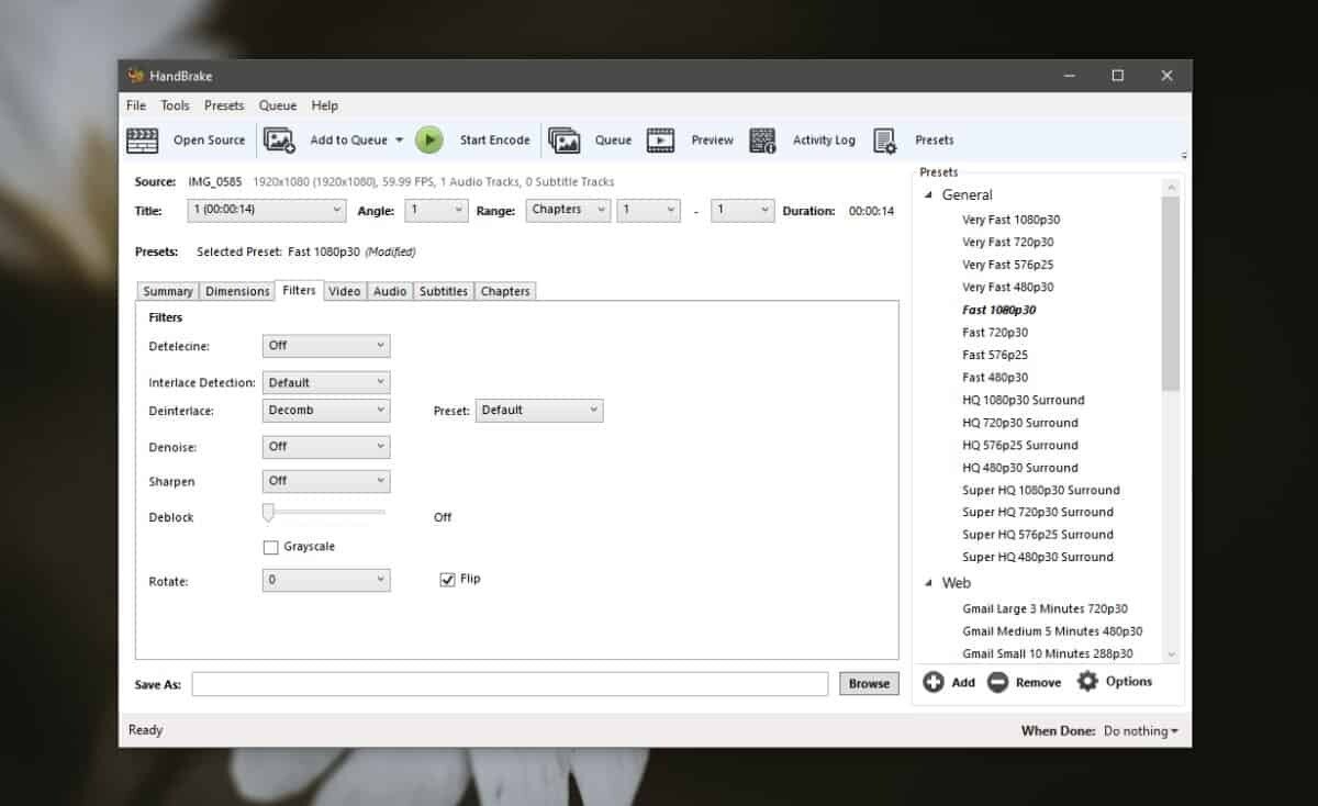 The flip is along the x-axis and there isn’t a setting that lets you flip it along the y-axis. If you need to flip a video along the y-axis, try rotating it first. You can do that in Handbrake from the Filters tab. Rotate it by 180 degrees and select the flip option to see if that does the trick. You may or may not be satisfied with the results though. This is a hack way to flip a video along the y-axis so you won’t always get the same results as you would get when you flip along the x-axis.