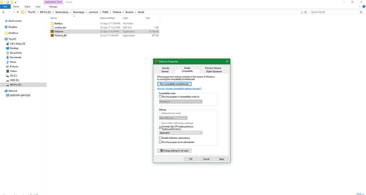 If the above does not solve your problem, there might be another solution you could try. It requires tinkering with the compatibility settings of the game. First step is to find the game directory (Default: C:\Program Files (x86)\Steam\steamapps\common\PUBG\TslGame\Binaries\Win64)