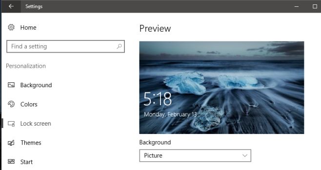 Open the Settings app and go to the Personalization group of settings. Select ‘Lock Screen’ and open the ‘Background’ drop-down. Select ‘Picture’ instead of Windows Spotlight and select an image. Lock your system once to make sure the image has been updated.