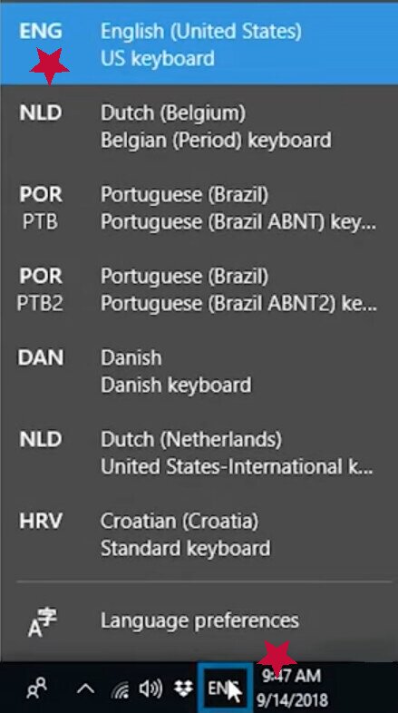8. Go to the very bottom right of your taskbar. You should see the language icon of your current keyboard layout. Click this icon to expand a menu of other layouts to choose from.