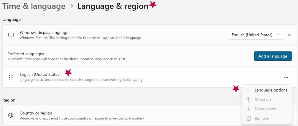 For Windows 11, the process is similar. Go to Settings > Time & language > Language & region, then choose English for the Windows display language, following the prompts.