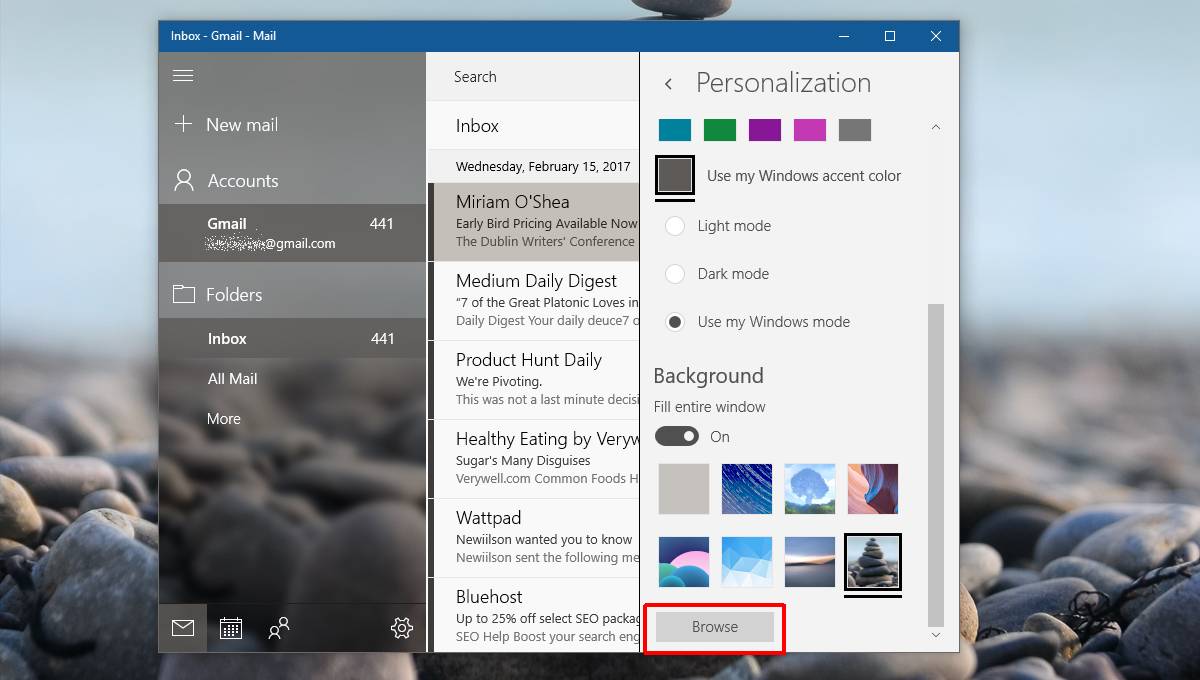 Windows 10 comes with a stock Mail app. It isn’t anything to write home about and Microsoft has made it so that it doesn’t compete with Outlook. For a basic app, it’s reasonably good. The Mail app supports multiple accounts and the People and Calendar apps are integrated in it well enough. It also has some really neat customization features which let you set a custom color and background for the app. You can set a different color and background for each account you’ve added to the app . This gives you an easy way to differentiate which account you’re currently using. Here’s how you can set a color and change the Mail app background in Windows 10.