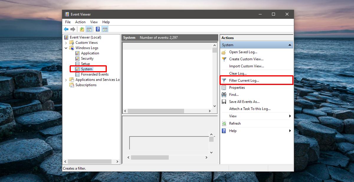 Open Event Viewer. You don’t need administrative rights to access this app. On the left column, expand Windows Logs and select ‘System’ under it. On the right column, select ‘Filter Current Log…’.