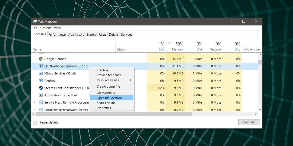 A process’ name in Task Manager may not be user friendly or it may not be the same as the app it runs. While this is poor decision making on the developer’s part, it doesn’t necessarily mean the process is being run by a malicious app. Right-click the process and select ‘Open file location’ from the context menu.