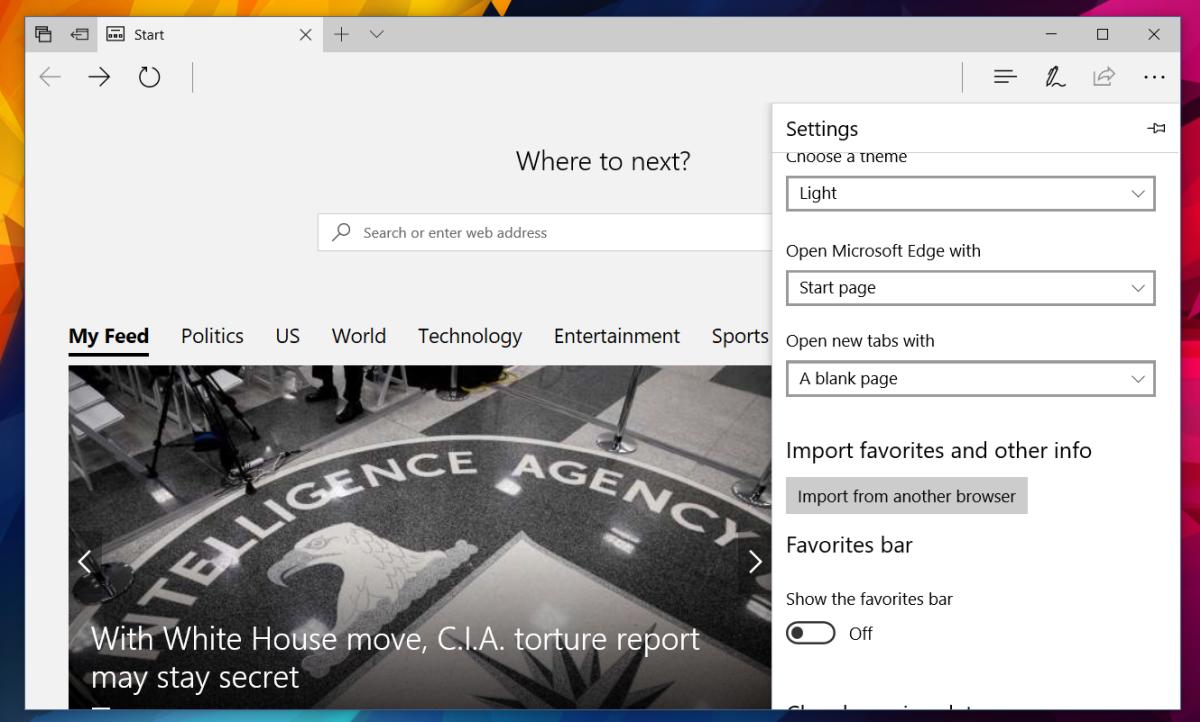 Open Microsoft Edge. Click the overflow button at the top right. From the panel that slides out, select ‘Settings’. Scroll down to the ‘Import favorites and other info’ section. Click the ‘Import from another browser’ option.