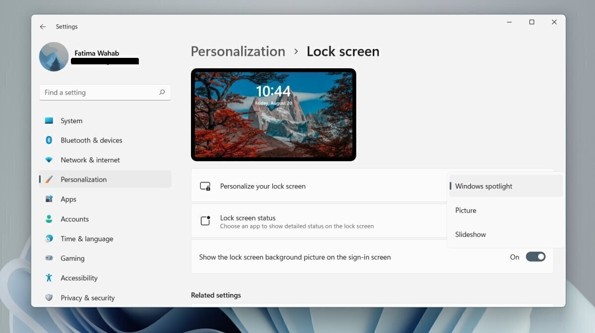 - Select one of the three options: Windows Spotlight, Picture, Slideshow.