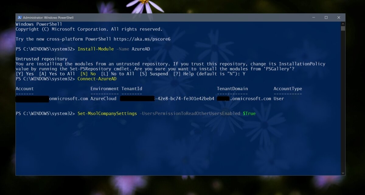 - Run the following command to install the AzureAD module. Tap Y if prompted to.