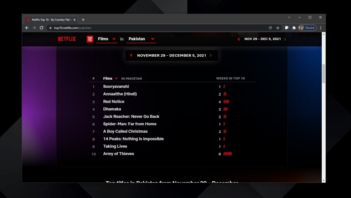 To view the Netflix to 10 titles worldwide, visit the official Top 10 website by Netflix. By default, the website shows global trends and English.