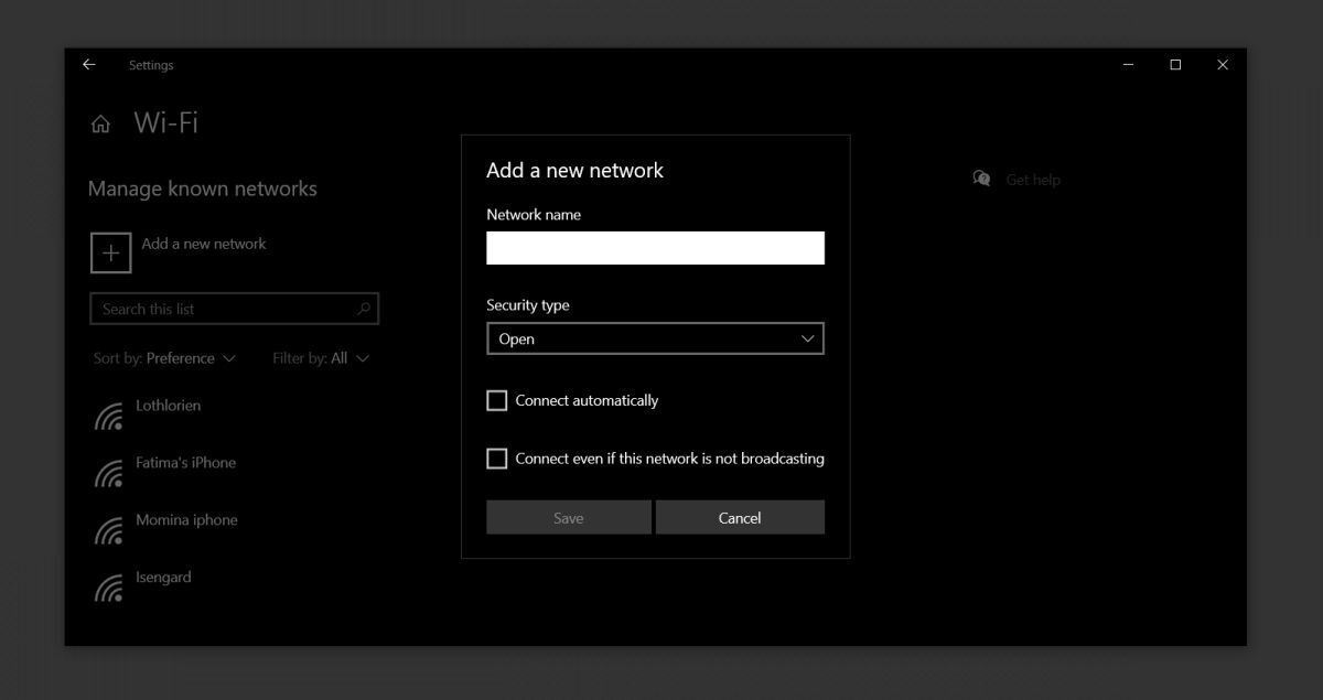 - In the window that opens, enter the name of the network, select the security type (check with the network admin), and then enter the password for it.