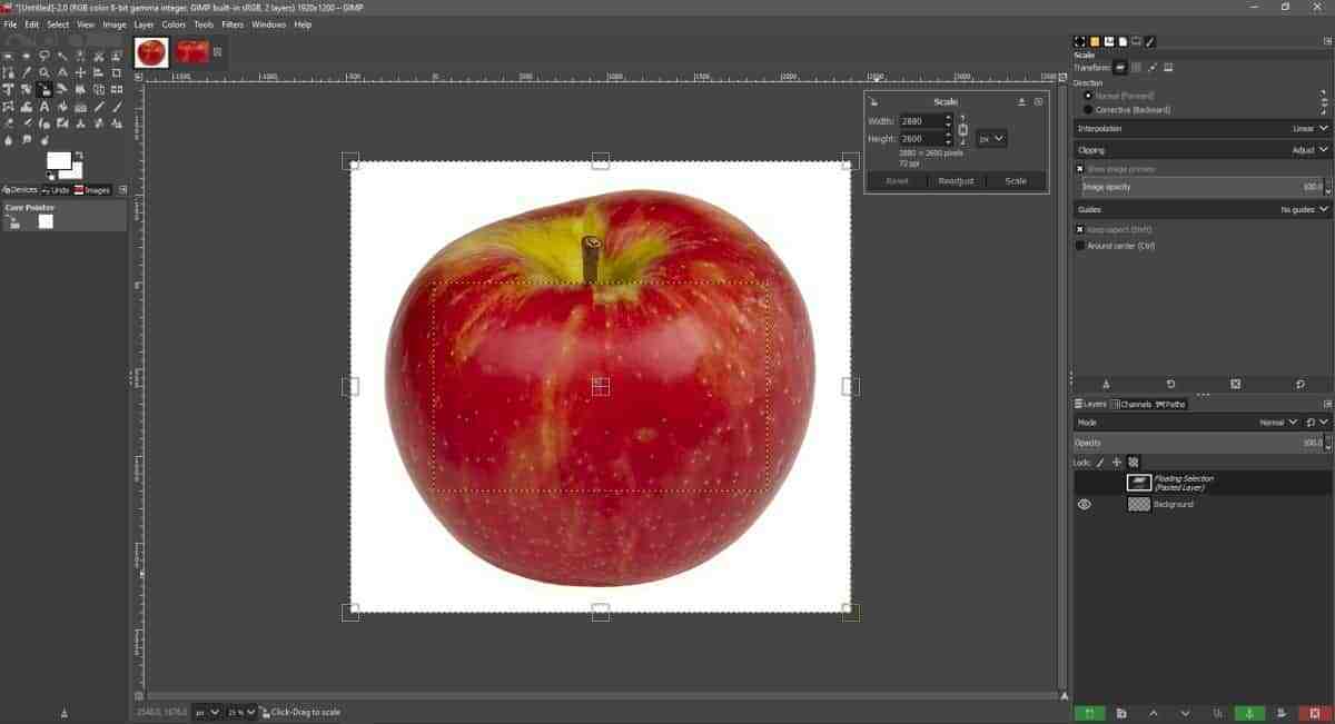 Open GIMP and create a new file with the dimensions you need. Copy and paste an image either from your disk or from another GIMP file in the new file that you just created. At this point, it is important to check if the image that you pasted is larger than your canvas size. If it is, and you create a layer out of it, you will lose everything that doesn’t fit in the canvas. Normally, a large image will be an easy tell but if you’re not sure and think the corners cut a bit close to the edge of the canvas, tap the Shift+S keyboard shortcut.