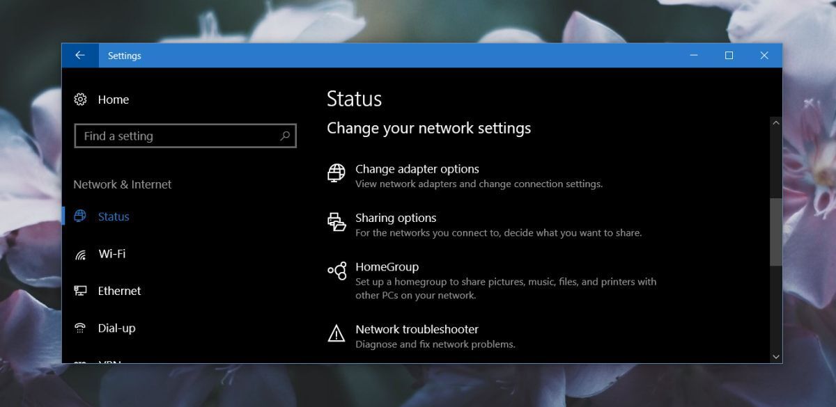 To stay safe on a public network, you should first and foremost, disable sharing over the network. On Windows 10, you can do this from the Settings app under Network & Internet>Status. Here you will find several network settings that you can manage, including one for Sharing.