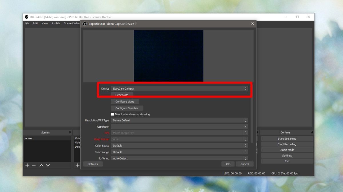 On your desktop, open OBS and add a new source. If you don’t know how to add a source, read our guide on how to get started with OBS. When you add the new source, you will have to select an input device. Open the Device dropdown, and select EpocCam,