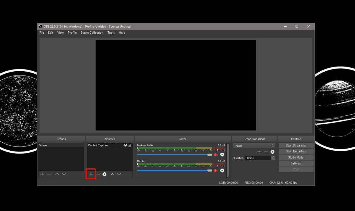 Install and launch OBS. You’ll see the following screen. Click the plus button under sources as indicated below.