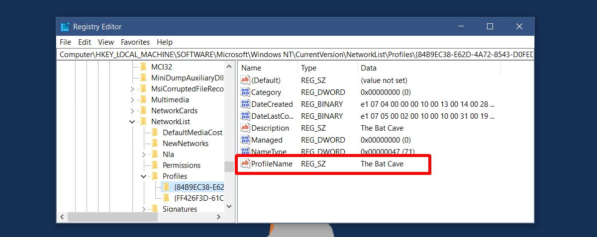 Here, you will see a bunch of keys with alphanumeric names that don’t make a lot of sense. Open each one and look for the ProfileName value. The folder that has a ProfileName value with your network’s name as its value is the key that belongs to your network.