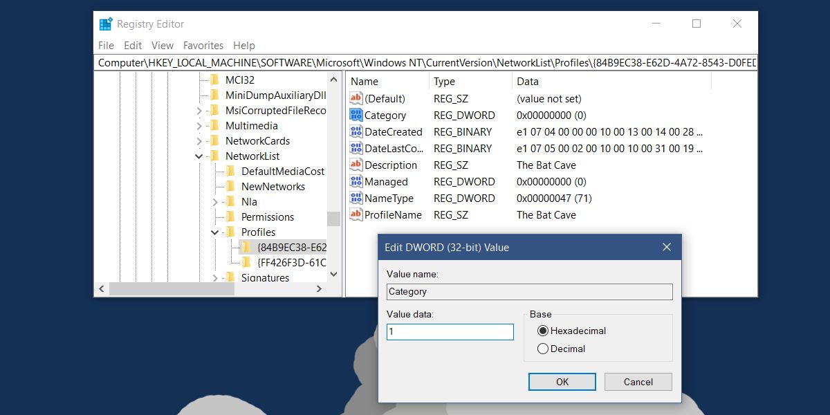 Double click the Category DWORD value and set its value to 1 to make the network private. Set its value to 0 to make it public.