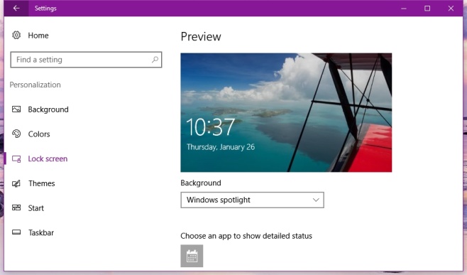 Enable Windows Spotlight Images; open the Settings app. Go to the Personalization group of settings and select Lock Screen. Open the Background drop-down and select ‘Windows Spotlight’ from the options. Give it a few seconds to update your lock screen image.