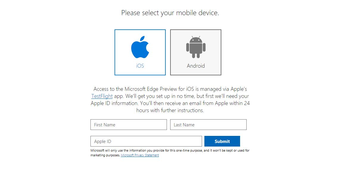 If you want to download Microsoft Edge preview for iOS, you need to enter you name, and your Apple ID. Beta builds of any app are installed on iOS via an app called TestFlight. You must have this app installed on whichever iOS device you plan to run Microsoft Edge preview on.