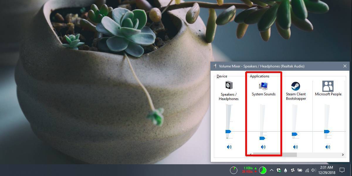 On the Volume Mixer window, reduce the slider for System Sound to zero and you won’t hear any more system sounds. This will also silence the sound alert you get for new notifications.
