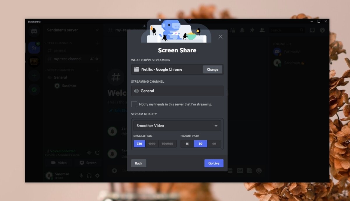 Streaming is bandwidth heavy process which is why, if you’re using the free version of Discord, you will be limited to 30 FPS and 720p resolution. If you want better frame rates or higher resolutions, you’re going to have to get Discord Nitro. It costs $100/year or $10/month.