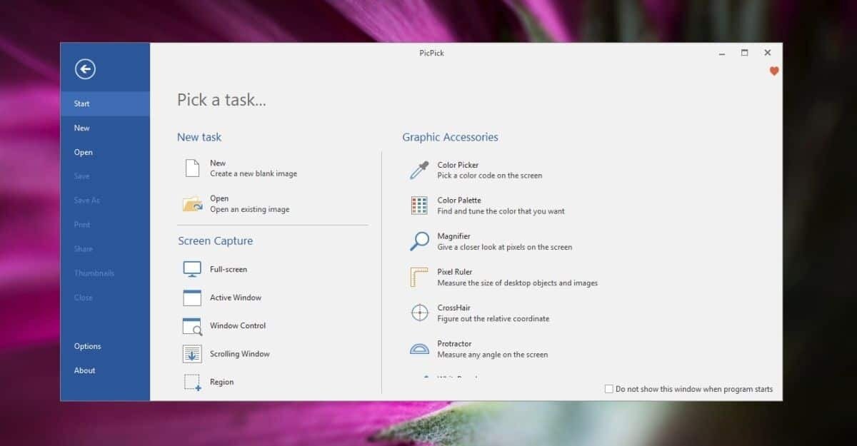 Download, install, and run PicPick. The start screen (which looks a bit too much like Microsoft Word) will offer you the option to take a scrolling screenshot. The app also supports hotkeys for this that you can customize from the options. You can access options from this same screen.