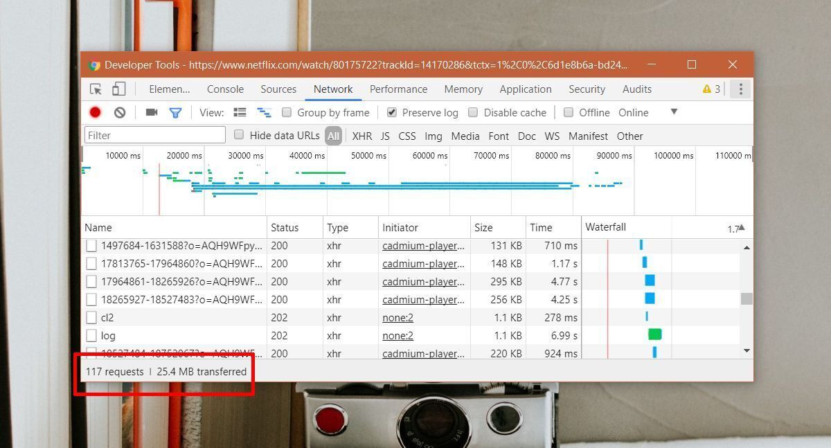 Open Netflix in your browser and tap the F12 key. Select the Network tab. If your browser supports it, select the ‘log’ option and refresh the page. Watch Netflix and at the end of a binge, you can see how much data was used. You will need to do this for every single Netflix session as browsers don’t actively monitor a domain for network usage.