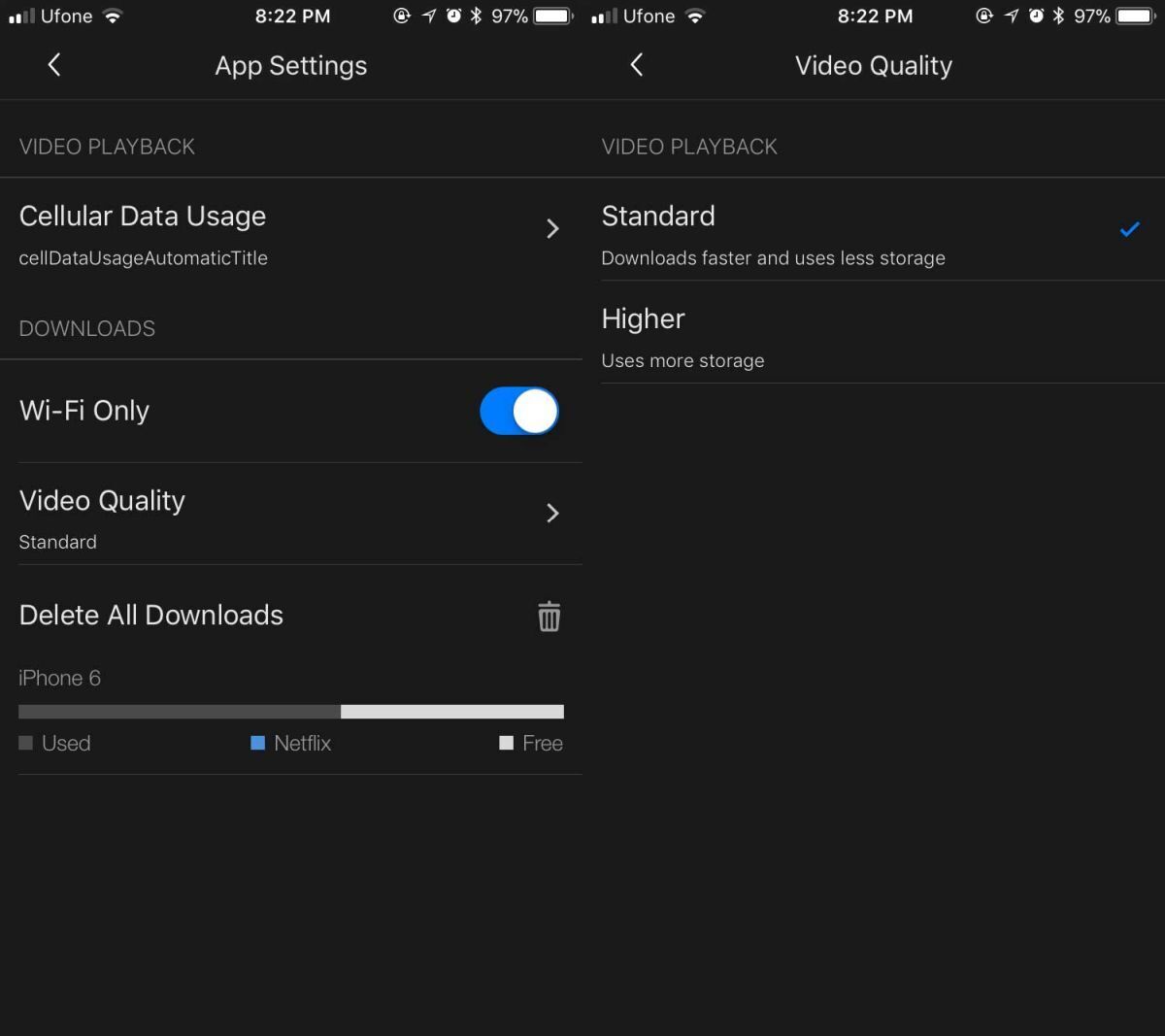 On iOS and Android, go to the Netflix app’s settings. Under Video Quality, select Standard to force Netflix to consume less data. This will apply to streaming over both cellular and WiFi networks.