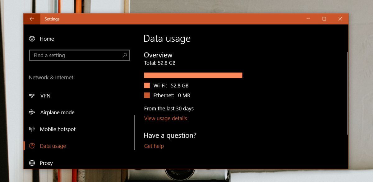 Windows 10 has a built-in data monitoring tool. It can give you stats for both a Wi-Fi and Ethernet connection. The usage is broken down on a per-app basis. You can view usage for the last 30 days.