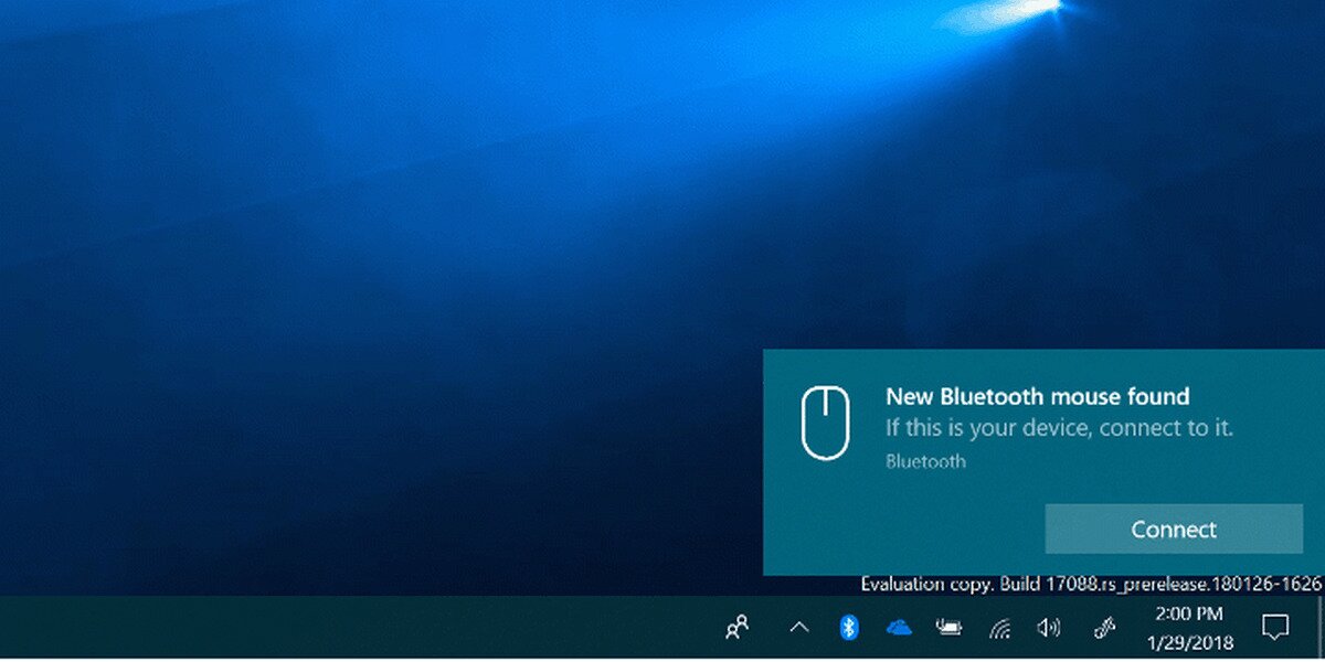 That’s all there is to it. The only thing you need to do now is turn on the Bluetooth device you want to pair. If it isn’t set to connect to another device nearby, it will turn on in ‘pairing’ mode. You should now see a notification like the one below (courtesy Microsoft), telling you that there’s a device nearby that’s ready for pairing. Click it, and the device will be paired and connected.