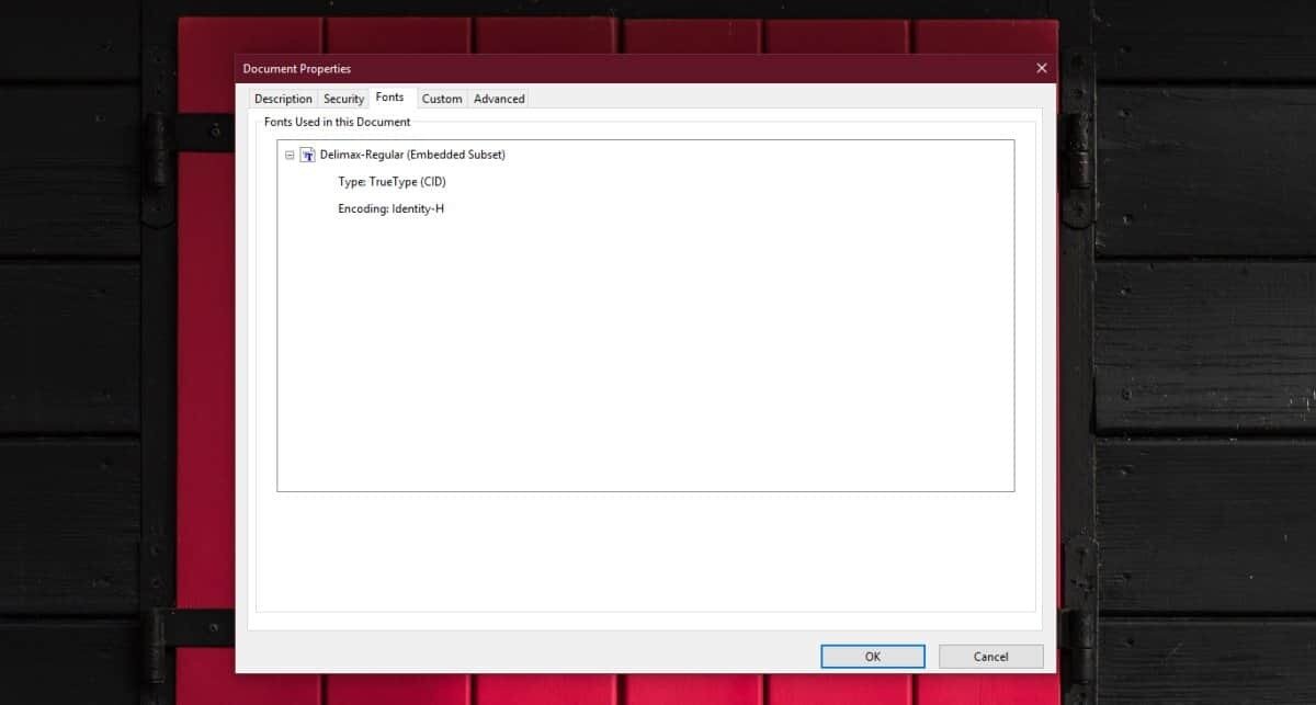 In the Properties window, select the Fonts tab and you will get a list of all the fonts that were used in the PDF file.