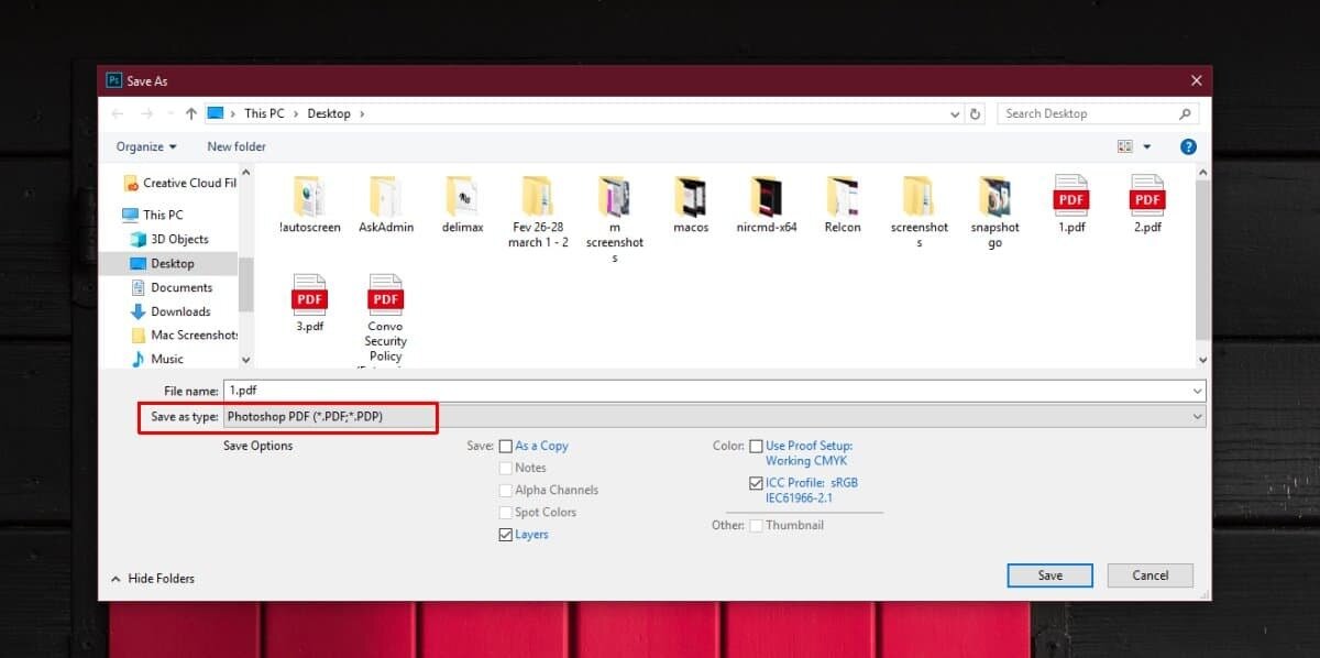 Open the Photoshop file that you want to view all fonts for. Once the file is open, and all its layers have properly loaded, go to File>Save As and save a copy of the file in PDF form. To do this, open the Save as type dropdown and select PDF from the list of supported file types.