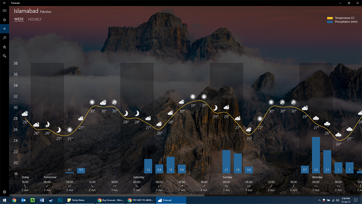 The Weather app comes bundled with Windows. It takes everything good about the above mentioned apps and bundles them into one simple representation. You get precipitation data, trends, graphs, forecasts, wind speeds, even the moon phases and everything in between. The design builds on the minimalist design we have grown to expect from Windows. A background image will show us a gorgeous image that accurately portrays the weather outside. The live tile app also shows a similar image when showing you the weather outside. The weather is powered by Foreca, there are no in-app purchases (you have a fully loaded app out of the box).