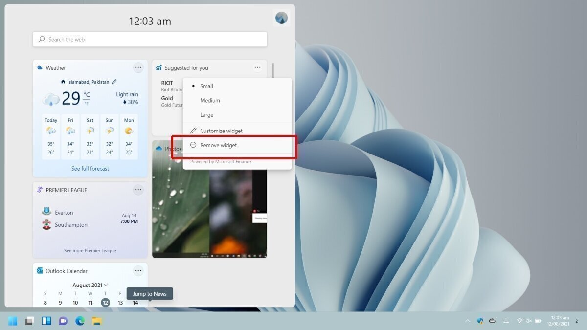 - Click the widgets icon on the taskbar to open the widgets panel.