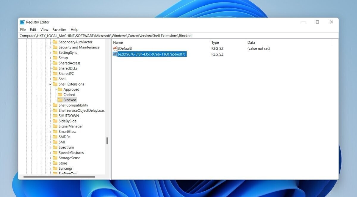 {e2bf9676-5f8f-435c-97eb-11607a5bedf7}. - Click Ok and close the registry editor.