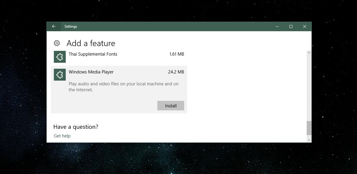 Look for Windows Media Players, and click the Install button. Windows Media Player will install. You won’t need to restart Windows.