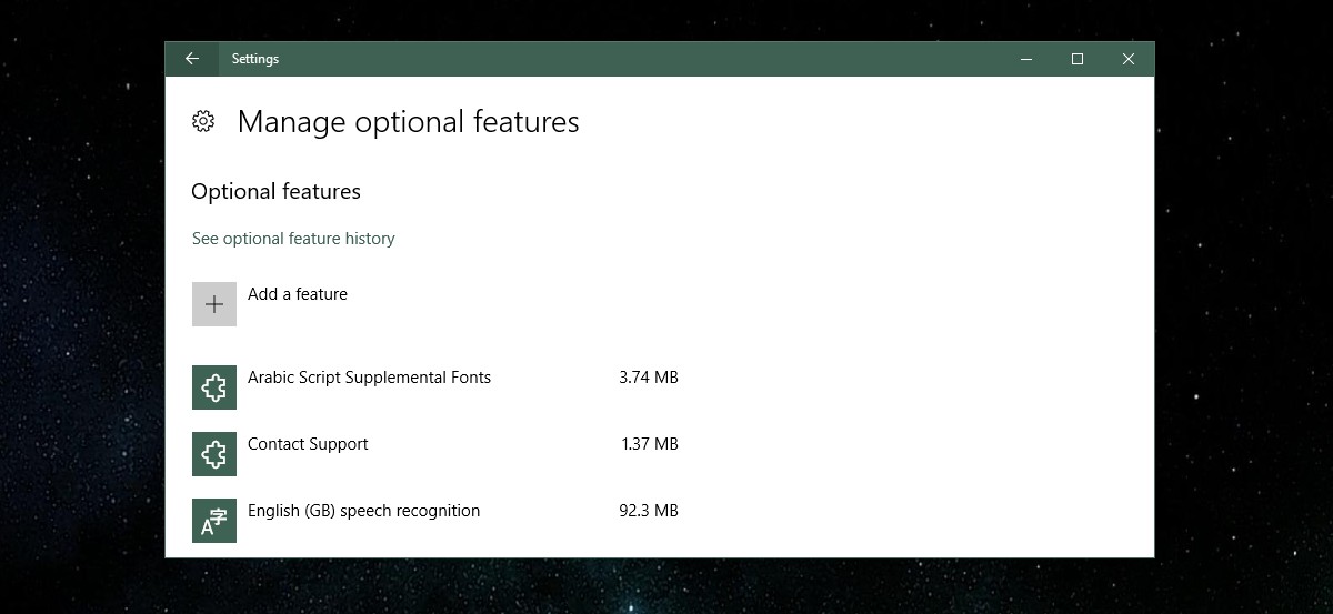 Open the Settings app and go to the Apps group of settings. Select the Apps & Features and look for the ‘Manage Optional Features’ option. Click it.