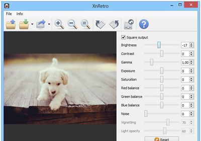 To get started, load an image into the application via drag and drop or by using the Add button. The application allows you to zoom in and out using buttons related buttons at the top, as well as rotate the image clockwise or counterclockwise if you wish. The image adjustment palette comes handy for fine-tuning an image, letting you control parameters like brightness, contrast, gamma, exposure, saturation, noise and RGB values. The Vignetting and Light opacity controls become available when you select the appropriate filters.